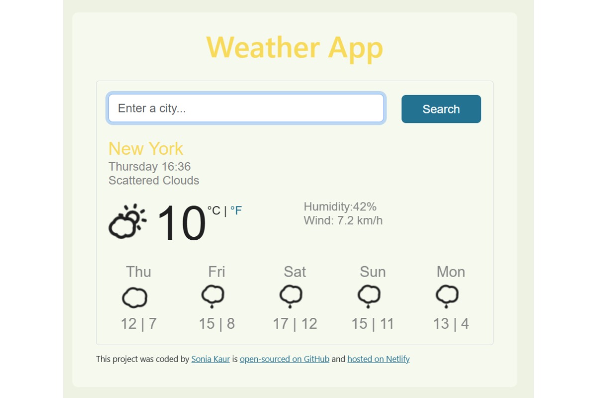 A responsive weather application built with React, Axios, and Bootstrap. It fetches real-time weather data from an API and displays current conditions and forecasts in a clean, user-friendly interface. Designed with reusable components to demonstrate dynamic data handling and state management in React.