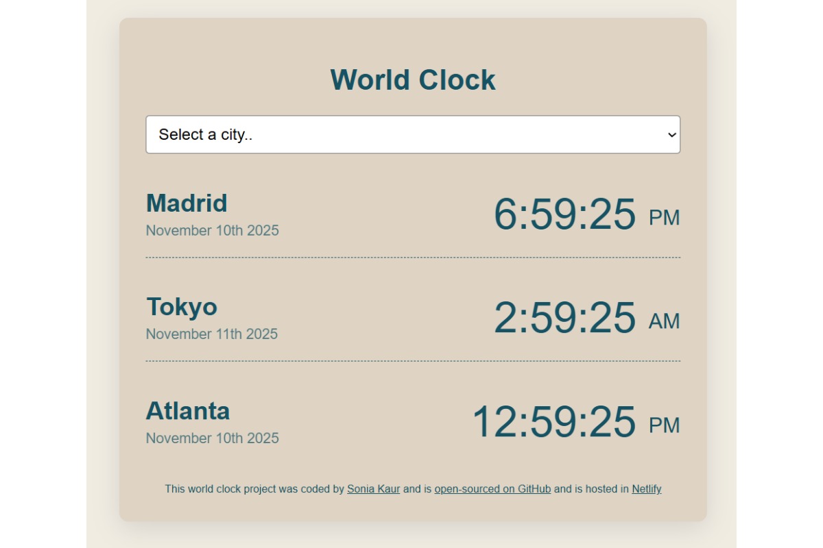 Launch ChattaLatin WebsiteAn interactive web app built with JavaScript, HTML, and CSS that displays the current time and date across multiple cities worldwide. Users can select their location or explore different time zones through a dynamic and responsive interface powered by the Moment.js library.